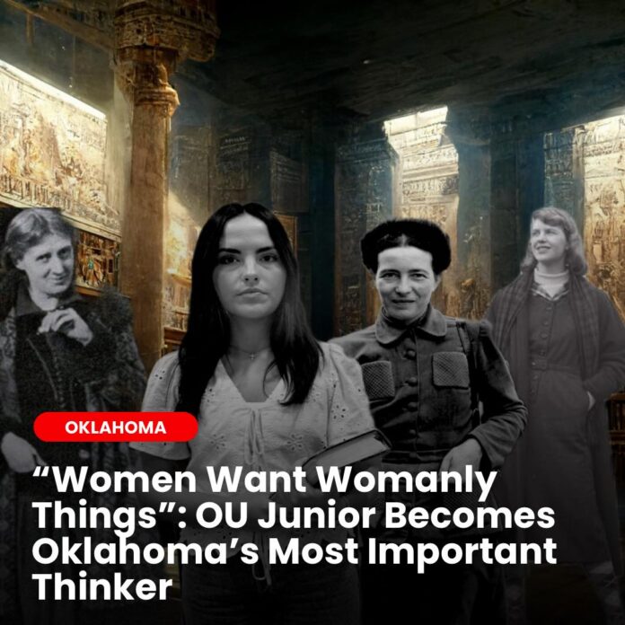 Genius and Oklahoma are two words that usually don’t go together in a single sentence, but that ends today. Oklahoma has once again made global news, proving that being 50th in education doesn’t mean a lack of talent. Samantha Fulnecky, a junior at the University of Oklahoma, is now being praised nationwide as one of the most important female thinkers of the modern era. Supporters compare her to Simone de Beauvoir, Virginia Woolf and Sylvia Plath. Fulnecky became one of the most notorious Oklahomans of all time thanks to an essay that has brought much needed enlightenment to the Midwest.
